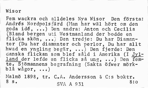 //// Wisor //// Fem wackra och alldeles Nya Wisor Den första: Andrés Nordpols färd (Man har wäl hört om den goda idé, ...) Den andra: Anton och Cecilia (Bland bergen uti Westmanland der bodde en flicka skön, ,..) Den tredje: Du har Diamanter (Du har diamanter och perlor, Du har allt hwad en yngling begär, ...) Den fjerde: Den danska flickan som blef såld i Amerika (I Jylland der lefde en flicka så ung, ..,) Den femte. Sjömannens begrafning (Sakta öfwer mörkblå wågor, ...) //// Malmö 1898, tr. C.A. Andersson a C:s boktr. 8 S> SVA A 931 8:0 ////