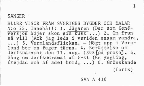 //// 1 //// SÅNGER //// ELLER VISOR FRÄN SVERIGES BYGDER OCH DALAR N:o 25. Innehåll: 1. Jägaren (Der som Gené-versjön höjer skön sin kust ...) 2. Om frun så vill (Ack jag leds i verlden ensam vandra, ...) 3. Verralandsflickan, - Högt upp i Verm-land bor en fager tärna. 4. Berättelse om Jerfsödramat den 11. aug. 1395£på prosa]. 5. Sång om Jerfsödramat af G-st (En yngling, frejdad och af ädel börd, ..,) 6. Grönskande //// (forts) //// SVA A 416 ////