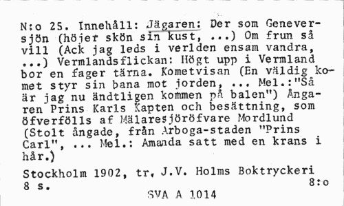 //// N*.o 25. Innehåll: Jägaren: Der som Genever-sjön (höjer skön sin kust, ...) Om frun så vill (Ack jag leds i verlden ensam vandra, ...) Vermlandsflickan: Högt upp i Vermland bor en fager tärna. Kometvisan (En väldig komet styr sin bana mot jorden, ... Mel.:"Så är jag'nu ändtligen kommen på balen") Ångaren Prins Karls Kapten och besättning, som öfverfölls af MälareSjöröfvare Mordlund (Stolt ångade, från Arboga-staden "Prins Carl", ... Mel.: Amanda satt med en krans i hår.) //// Stockholm 1902, tr, J.V. Holms Boktryckeri 8 s. 8ro //// SVA A 1014 ////