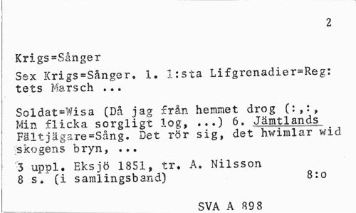 //// 2 //// Krigs=Sånger //// Sex Krigs=Sånger. 1. l:sta Lifgrenadier=Reg: tets Marsch ... //// Soldat=Wisa (Då jag från hemmet drog (:,:, Min flicka sorgligt log, ...) 6. Jämtlands Fältjägare=Sång. Det rör sig, det hwimlar wid skogens bryn, ... //// 3 uppl. Eksjö 1851, tr. A. Nilsson 8 s. (i samlingsband) 8:o //// qva b sqs ////
