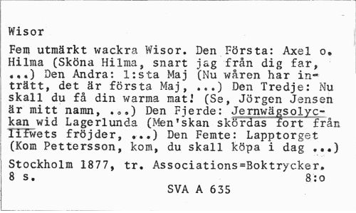 //// Wisor //// Fem utmärkt wackra Wisor. Den Första: Axel o, Hilma (Sköna Hilma, snart jag från dig far, «,.) Den Andra: l:sta Maj (Nu wåren har inträtt, det är första Maj, ...) Den Tredje: Nu skall du få din warma matJ (Se, Jörgen Jensen är mitt namn, ,..) Den Fjerde: Jernwägsolyc-kan wid Lagerlunda (Men'skan skördas fort från Tifwets fröjder, .) Den Femte: Lapptorget (Kom Pettersson, kom, du skall köpa i dag ,..) //// Stockholm 1877, tr. Associations=Boktrycker. 8 s. 8:0 //// SVA A 635 ////