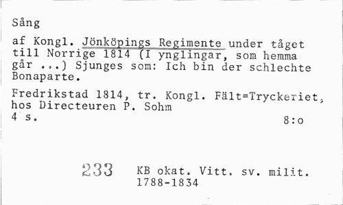 //// Sång //// af Kongl. Jönköpings Regimente under tåget till Norrige 1814 (T ynglingar, som hemma går . ,.) Sjunges som: Ich bin der schlechte Bonaparte. //// Fredrikstad 1814, tr. Kongl. Fält=Tryckeriet, hos Directeuren P. Sohm //// 4 s . 8 : o //// 233 KB okat. Vitt, sv. milit. //// 1788-1834 ////