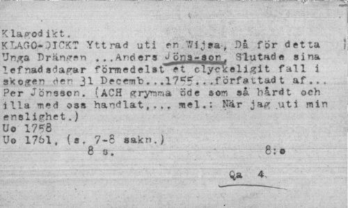 //// Klagodikt. //// KlACrO-DTCKT Ytt rad uti en"Wijsa-, Då för detta Unga Drämren . . . And er 9 ^öria-son Slutade sina lefnadsdagar förmedelst et clyckeligit fall i skogen den 31 Decemb.. .1755,•.författad t af... Per Jönsson. (ACH grymma öde som så hårdt och illa med oss handlat»... mel.; När jag .uti min ensli.rrhet.) Uo 17c8 //// Uo 1761, (a. 7-8 aakn.j //// 8 s. 8:0 //// <<a 4. ////