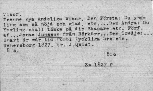 //// Visor. //// Trenne nya Åndeliga Wi«or, Pen Första; Du yng-lins? aoni så nöjd och glad, etc,...Den Ändra; Du Yngling skal1 tänka på din Skapare etc. Förf. af...Jonas Jönsson från Rörkärr... Den Tredje:.. Snart är w&r tid Törbi Lyckliga äro etc. Tenersborg 1827. tr. J.Qwist. 8 s. //// 8: o Zz 1827 f ////