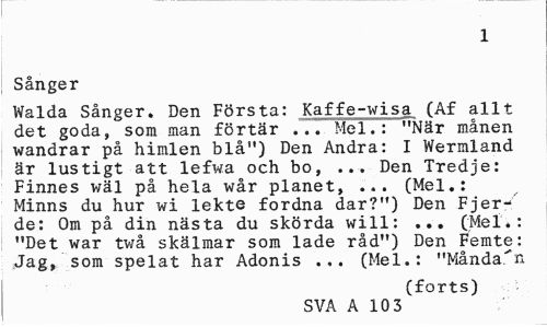 //// 1 //// Sånger //// Walda Sånger. Den Första: Kaffe-wisa (Af allt det goda, som man förtär ... Mel.: "När månen wandrar på himlen blå") Den Andra: I Wermland är lustigt att lefwa och bo, ... Den Tredje: Finnes wäl på hela wår planet, ... (Mel.: Minns du hur wi lekte fordna dar?") Den Fjer-de: Om på din nästa du skörda will: ... (Mel.: "Det war twå skälmar som lade råd") Den Femte: Jag, som spelat har Adonis ... (Mel.: "Månda^n //// (forts) //// SVA A 10 3 ////
