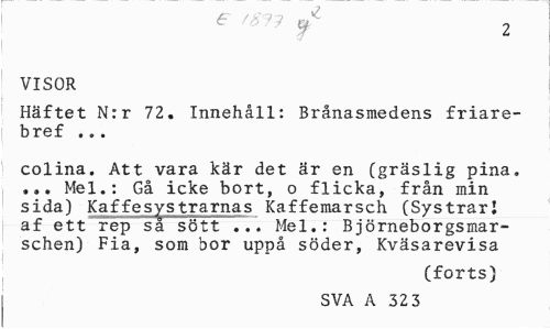 //// 6 " 1 t 2 //// VISOR //// Häftet N:r 72. Innehåll: Brånasmedens friare-bref ... //// colina. Att vara kär det är en (gräslig pina. //// Mel.: Gå icke bort, o flicka, från min sida) Kaffesystrarnas Kaffemarsch (Systrar! af ett rep så sött ... Mel.: Björneborgsmarschen) Fia, som bor uppå söder, Kväsarevisa //// (forts) //// SVA A 32 3 ////