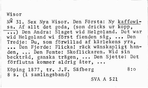 //// Wisor //// N= 31. Sex Nya Wisor. Den Första: Ny kaffewi-sa. Af allt det goda, (som dricks ur kopp, ...) Den Andra: Slaget wid Helgoland. Det war wid Helgoland wi först fienden såg, ... Den Tredje: Du, som förwillad af kärlekens yra, ... Den Fjerde: Flicka! räck wänskapligt handen, ... Den Femte: Skoflickaren. Wid sin becktråd, ganska trägen, ... Den Sjette: Det förflutna kommer aldrig åter, ... //// Köping 1877, tr. J.F. Säfberg 8:0 //// 8 s. (i samlingsband) //// SVA A 5 21 ////