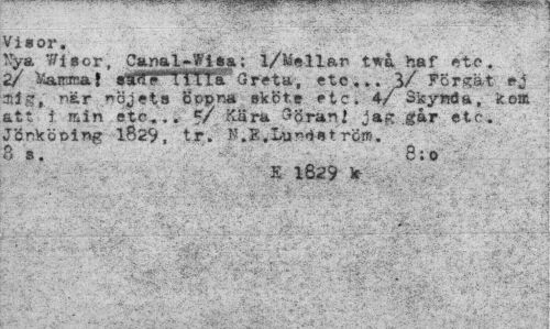 //// Visor» //// tfya Wisor, Canal-Wisa; l/Mellar t*å haf et o. 2/ ^aitmsa! «*tfé"THTa Greta, etc ... V Förgät ej ajjj. när "öjets öopna sköte etc. 4/ Skynda, kom att 'i rr.in etc... 5/ KU ra 33ra.nl jag går etc. Jönköoing 1829, tr. ».».Luddetröj». //// o & 8;° //// ' K 1829 k . //// • . ¦ * ">*5 ' f " 'A '. ;iv //// £ " - - • ' :<W\ : - " - - ¦ '. //// ¦ ¦ _ . ; '"V " i ¦¦ ••¦''. !-V- . 7 '•'. > \ .•• ' . v ////