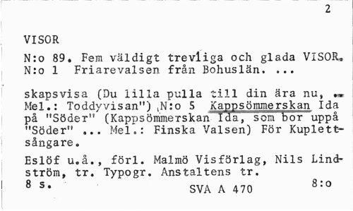 //// L //// VISOR //// N:o 89. Fem väldigt trevliga och glada VISOR* N:o 1 Friarevalsen från Bohuslän, ... //// skapsvisa (Du lilla pulla till din ära nu, Mel.: Toddyvisan") tN:o 5 Kappsömmerskan Ida på "Söder" (Kappsömmerskan Ida, som tor uppå "Söder" ... Mel".: Finska Valsen) För Kuplettsångare . //// Eslöf u.å., förl. Malmö Visförlag, Nils Lindström, tr. Typogr. Anstaltens tr. //// 8 s* SVA A 470 8:0 ////