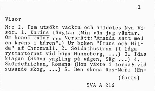 //// 1 //// Visor //// N:o 2, Fem utsökt vackra och alldeles Nya Visor. 1. Karins längtan (Min vän jag väntar. Om honom talar ... Versmått:"Amanda satt med en krans i håren".) Ur boken "Frans och Hilda" af Chronwall. 2. Soldathustrun (I låga ryttartorpet vid höga Hunneberg, ...) 3. Idas klagan (Sköna yngling på vågen, Säg .,.) 4. Skördeflickan, Romans (Hon växte i torpet vid susande skog, 5. Den sköna Ros-Mari (En- //// (forts) //// SVA A 216 ////