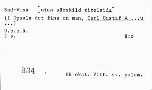 //// Bad-Visa [utan särskild titelsida"] (I Upsala det fins en man, Carl Gustaf A .. ,vl //// U.o.o.å. //// 2 s. 8:0 //// 934 //// KB okat. Vitt. sv. polem. ////