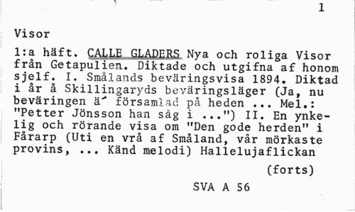 //// J. //// Visor //// l:a häft. CftLLE GLADERS Nya och roliga Visor från Getapulien. Diktade och utgifna af honom sjelf. I. Smålands beväringsvisa 1894. Diktad i år å Skillingaryds beväringsläger (Ja, nu beväringen ä" församlad på heden ... Mel.: "Petter Jönsson han säg i ...") II. En ynke-lig och rörande visa om "Den gode herden" i Fårarp (Uti en vrå af Småland, vår mörkaste provins, ... Känd melodi) Hallelujaflickan //// (forts) //// SVA A 56 ////
