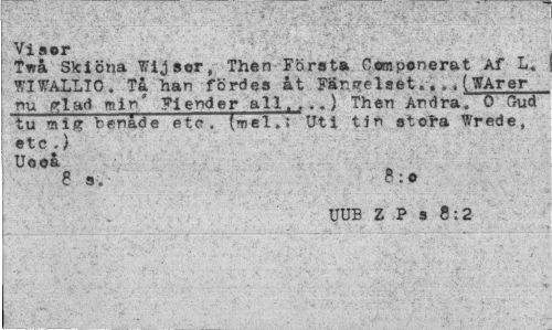 //// i .'/V;. : f ' //// Vi ser //// Twå Skiöna Wijser, Then Första Compenerat Af L„ WIWALLIO. Tå han fördes åt Fängelset...,(WArer //// nu friad min" Fiender all___) Then Andra, O Gud //// tu rniis: benäde etc. (»nel.j Uti tin stora Wrede, //// etc.) //// Uooå //// 6 S. P;o //// UUB Z P s 8:2 ////