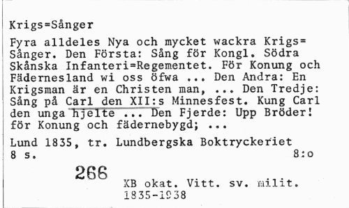 //// Krigs=Sånger //// Fyra alldeles Nya och mycket wackra Krigs= Sånger. Den Första: Sång för Kongl. Södra Skånska Infanteri=Regementet. För Konung och Fädernesland wi oss öfwa ... Den Andra: En Krigsman är en Christen man, ... Den Tredje: Sång på Carl den XII:s Minnesfest. Kung Carl den unga~KJelte ... Den Fjerde: Upp Bröder! för Konung och fädernebygd; ... //// Lund 1835, tr. Lundbergska Boktryckeriet 8 s. 8:0 //// 266 //// XB okat. Vitt. sv. milit. //// 1835-1938 ////