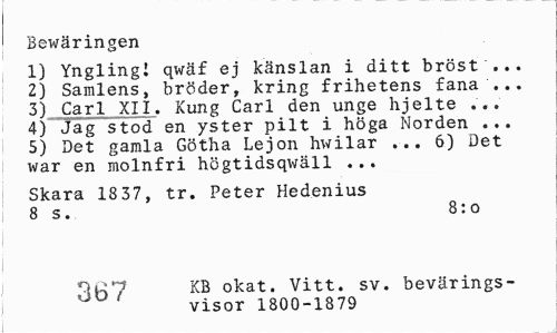 //// Bewäringen //// 1) Yngling! qwäf ej känslan i ditt bröst'... //// 2) Samlens, bröder, kring frihetens fana'... //// 3) Carl XII. Kung Carl den unge hjelte ... //// 4) Jag stod en yster pilt i höga Norden ... //// 5) Det gamla Götha Lejon hwilar ... 6) Det war en molnfri högtidsqwäll ... //// Skara 18 37, tr. Peter Hedenius 8 s. 8:o //// KB okat. Vitt. sv. bevärings-visor 1800-1879 ////