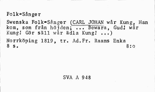 //// Folk=Sånger //// Swenska Folk-Sånger (CARL JOHAN wår Kung, Han kom, som från höjden; 777 Bewara, Gudl wår Kungi Gör säll wår ädla Kung.' ...) //// Norrköping 1819, tr. Ad.Fr. Raams Enka 8 s. 8:o //// SVA A 948 ////