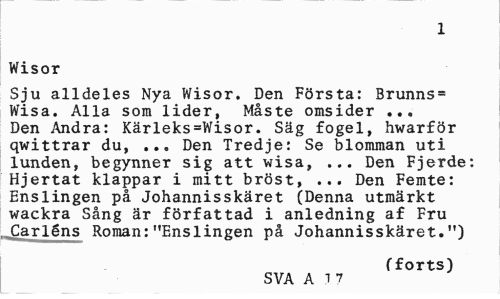 //// 1 //// Wisor //// Sju alldeles Nya Wisor. Den Första: Brunns= Wisa. Alla som lider, Måste omsider ... Den Andra: Kärleks=Wisor. Säg fogel, hwarför qwittrar du, ... Den Tredje: Se blomman uti lunden, begynner sig att wisa, ... Den Fjerde: Hjertat klappar i mitt bröst, ... Den Femte: Enslingen på Johannisskäret (Denna utmärkt wackra Sång är författad i anledning af Fru Carléns Roman:"Enslingen på Johannisskäret.") //// (forts) //// SVA A 17 ////