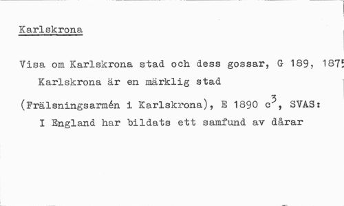 //// Karlskrona //// Visa om Karlskrona stad och dess gossar, G 189, 187 Karlskrona är en märklig stad //// (Frälsningsarmén i Karlskrona), E 1890 c , 3VAS: I England har bildats ett samfund av dårar ////