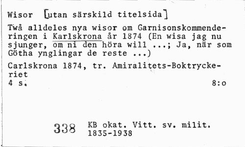//// Wisor (jitan särskild titelsida^ //// Twå alldeles nya wisor om Garnisonskommende-ringen i Karlskrona år 1874 (En wisa jag nu sjunger, om ni den höra will Ja, när som //// Götha ynglingar de reste ...) //// Carlskrona 1874, tr. Amiralitets-Boktryckeriet //// 4 s, 8:o //// ono KB okat. Vitt. sv. milit. //// 1835-1938 ////