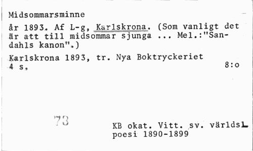 //// Midsommarsminne //// år 1893. Af L-g, Karlskrona. (Som vanligt det är att till midsommar sjunga ... Mel.:"Sandahls kanon".) //// Karlskrona 189 3, tr. Nya Boktryckeriet 4 s, 8:o //// i ' > //// KB okat. Vitt. sv. världsL. //// poesi 1890-1899 ////