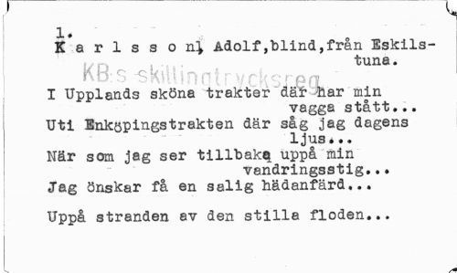 //// v //// 1. //// Karlsson^ Adolf,blind,från Eskilstuna. //// KB:S -skrtlinqtrycksretL //// I Upplands sköna trakter dät har min //// vagga stått... Uti Enköpingstrakten där såg jag dagens //// ljus * *. //// När som jag ser tillbak^ uppå min //// vandringsstig... Jag önskar få en salig hädanfärd... //// Uppå stranden av den stilla floden... ////