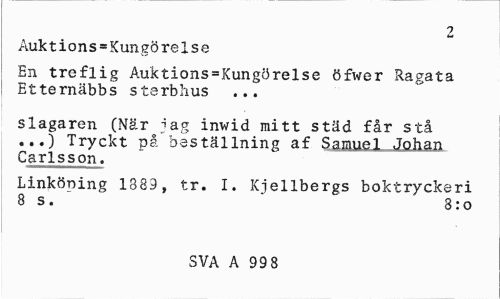 //// o //// Auktions»Kungörelse //// En treflig Auktions=Kungörelse öfwer Ragata Etternäbbs sterbhus ... //// slagaren (När jag inwid mitt städ får stå ...) Tryckt på beställning af Samuel Johan Carlsson. //// Linköping 1389, tr. I. Kjellbergs boktryckeri 8 s. " 8:0 //// SVA A 99 8 ////