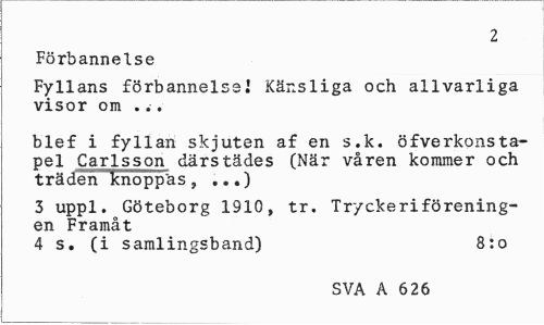 //// 2 //// Förbannelse //// Fyllans förbannelse* Känsliga och allvarliga visor om ... //// blef i fyllan skjuten af en s.k. öfverkonsta-pel Carlsson därstädes (När våren kommer och träden knoppas, ...) //// 3 uppl. Göteborg 1910, tr. Tryckeriföreningen Framåt //// 4 s. (i samlingsband) 8:o //// SVA A 626 ////