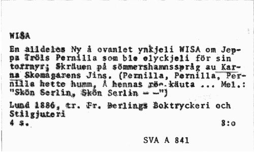 //// WI$A //// En alldeles Ny å ovanlet ynkjeli WISA om Jep~ fm STröis Pernilla som bl» olyckjeli för sin taftrafff Skräuen på sömmershamnsspråg au Karna Skorna gar ens Jins. (Pernilla, Pernilla, Pernilla hette humm, Å hennas 0Ä«.3cäuta ... Mel.: "Skön Ser lin,, Skön Serlin ~ //// Lmå 1884, tr. fr, »erling* Boktryckeri och Stil gjuteri //// 4 s. 8:0 //// SVA A 841 ////