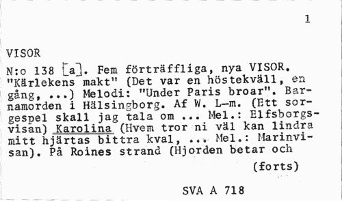 //// 1 //// VISOR //// N:o 138 la}. Fem förträffliga, nya VISOR. "Kärlekens makt" (Det var en höstekväll, en gång, ...) Melodi: "Under Paris broar". Barnamorden i Hälsingborg. Af W. L-m. (Ett sorgespel skall jag tala om ... Mel.: Elfsborgs-visan) Karolina (Hvem tror ni väl kan lindra mitt hjärtas bittra kval, ... Mel.: Marinvisan). På Roines strand (Hjorden betar och //// (forts) //// SVA A 718 ////