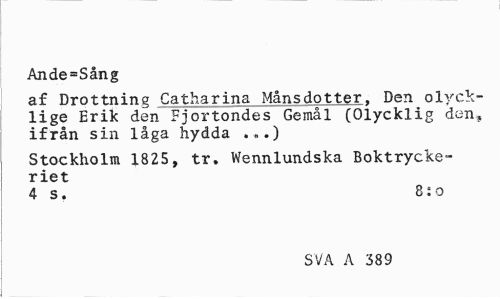 //// Ande=Sång //// af Drottning Catharina Månsdotter, Den olycklige Erik den Fjortondes Gemål (Olycklig den, ifrån sin låga hydda ...) //// Stockholm 1825, tr. Wennlundska Boktryckeriet //// 4 s. 8:0 //// SVA A 389 ////