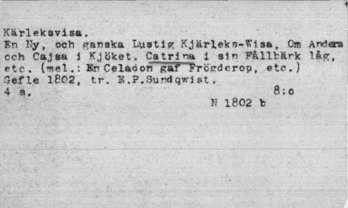 //// Kärleksvisa. //// En Hy, och panska Lustig K j ärlek sa, Om Andara cch Caj sa j Kjöket. Catrina i sin Fålltärk låg, etc. (*nel.: Er Celaöon gaTTrösxderop, etc.) Gefle 1802, tr. E .P.Sundqviat. A a, 8; o //// M 1802 t ////