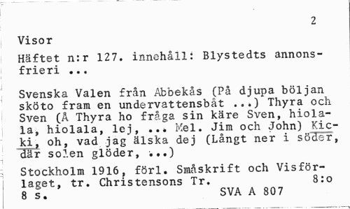 //// 2 //// Visor //// Häftet n:r 127. innehåll: Blystedts annonsfrieri ... //// Svenska Valen från Abbekås (På djupa böljan sköto fram en undervattensbåt ...) Thyra och Sven (A Thyra ho fråga sin käre Sven, hiola-la, hiolala, lej, . Mel. Jim och John) Kicki, oh, vad jag älska dej (Långt ner i söder, där solen glöder, ...) //// i Stockholm 1916, förl. Småskrift och Vis förlaget, tr. Christensons Tr. 8:o 8 s. SVA A 807 ////