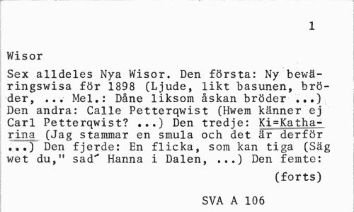 //// 1 //// Wisor //// Sex alldeles Nya Wisor. Den första: Ny bewä-ringswisa för 1898 (Ljude, likt basunen, bröder, ... Mel.: Dåne liksom åskan bröder ...) Den andra: Calle Petterqwist (Hwem känner ej Carl Petterqwist? ...) Den tredje: Ki=Katha-rina (Jag stammar en smula och det är derför ...) Den fjerde: En flicka, som kan tiga (Säg wet du," sad" Hanna i Dalen, ...) Den femte: //// (forts) //// SVA A 106 ////