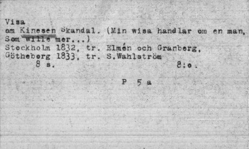 //// Visa //// om Kinesen Sandal. (Min wisa handlar oro en man, //// "fffjyaer...) //// Stockholm 1832, tr. Elmer, och Granberg, //// Gotheborg 1833. tr. S.Wahlström //// 8 s. 8:e . //// ti '' f P £ a -.V V-.:; ; ////