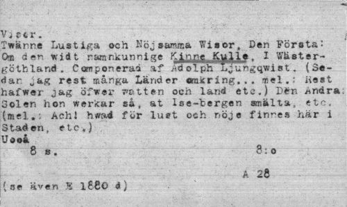 //// * ?tv . //// Twänne Lustiga och Nöjsamma Wisor, Den Första: Qn den wid t namnkunnige Kfrnne Kullo. I Wäster-göthland . Componerad af idolph Ljungqwist, (Sedan Jag rest många Länder ttnkring. . , mel.; lie st hafwer jag öfwer vetten och land etc.) Bfcn Andra Solen hon vterkar skt at lse-fcergen smälta, etc, (mel.- Ach! h«rad för lust och nöje finnes här i Staden, etc.) Uooå //// 8s. 8:O //// A 28 //// (ne även 8 l680 d) ////
