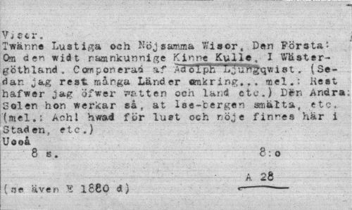 //// V j c t r. //// Twänne Lustiga och Nöj samma Wisor, Den Första: Om den wid t namnkunnige Kjnne Kulle, I Wäster-göthland . Ccmponerad af 'Möi pfe ill j u f*gqwist .• (Sedan jag rest. många Länder omkring... mel.; Hest hafwer jag öfwer F&tten och land etc.) Den Andra; Solen hon wericar så, at Ise-fcergen smal ta, etc, (mel.; Achl hwad för lust och nöje finnes här i Staden, etc.) Uooå //// 8 s. 8:0 //// A 28 //// (se även K l880 d) «=- ////