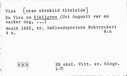 //// i //// Visa (utan särskild titelsidaJ //// En Visa om Kjellgren (Uti Augusti var en vacker dag, ...) //// Wexiö 1895, tr. Smålandspostens Boktryckeri 4 s. 8:0 //// i //// 888 KB okat. Vitt. sv. biogr. //// i ////