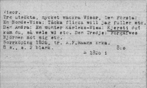 //// *iaor. //// Tre utsökta, »uycket wackra Wisor, D«n Första: En Eonde-Wisa; Tåcka flicka wi 11 jag fuller etc. Den nndra: En munter Xarleks-Wisa: KJersti dut kom du, så wele wi etc. Den Tredje: iorgarwes Björnen aict mig etc. Norrköping 1&26, tr. Ä.F.ftaams fcnka. 8 s., s. 2 blank . 8; o //// ä l82o i ////