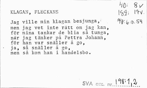 //// HÖ- Si/ //// KLAGAN, FLECKANS Jfå- l^V- //// Jag ville min klagan besjunga, "f^fc, //// men jag vet inte rätt om jag kan, //// för mina tankar de blia så tunga, //// när jag tänker på Pettra Johann, //// för han var snäller å go, //// ja, så snäller å go, //// men så kom han i handelsbo. //// SVA ea nr.W^ ////