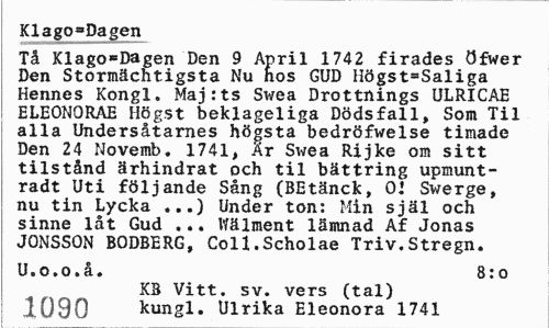 //// KlagcDagen //// Tå Klago«=Dagen Den 9 April 1742 firades öfwer Den Stormächtigsta Nu nos GUD Högst=Saliga Hennes Kongl. Maj:ts Swea Drottnings ULRICAE ELEONORAE Högst beklageliga Dödsfall, Som Til alla Undersåtarnes högsta bedröfwelse timade Den 24 Novemb. 1741, Är Swea Rijke om sitt tilstånd ärhindrat och til bättring upmunt-radt Uti följande Sång (BEtänck, 01 Swerge, nu tin Lycka ...) Under ton: Min själ och sinne låt Gud ... Wälment lämnad Af Jonas JONSSON BODBERG, Coll.Scholae Triv.Stregn. //// U.o.o.å. 8:o //// KB Vitt. sv. vers (tal) 1090 kungl. Ulrika Eleonora 1741 ////