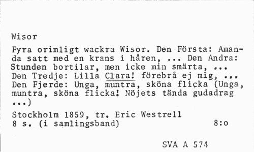 //// Wisor //// Fyra orimligt wackra Wisor. Den Första: Amanda satt med en krans i håren, ... Den Andra: Stunden bortilar, men icke min smärta, ... Den Tredje: Lilla ClaraJ förebrå ej mig, ... Den Fjerde: Unga, muntra, sköna flicka (Unga, muntra, sköna flicka! Nöjets tända gudadrag //// Stockholm 1859, tr. Eric Westrell 8 s. (i samlingsband) 8:0 //// SVA A 5 74 ////