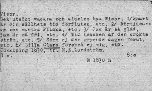//// Visor. //// Sex. utsökt waokra och aldeles kya Wisor, l/3narfr ir din sällhats tid förfluten, etc. 2/ Fcrtjusan-ae och muntra Flicka, etc. 3/ ^»K är && glad, jag är så fri, etc. 4/ Vid hwasssn af den krökta ström, etc. 5/ Sorg ej den gryende dagen förut, etc. 6/ Lilla Clara förebrå ej mig, etc. Jönköping lÖloT^TrT .Lundström. 3 s . 8: o //// a 1830 h ////