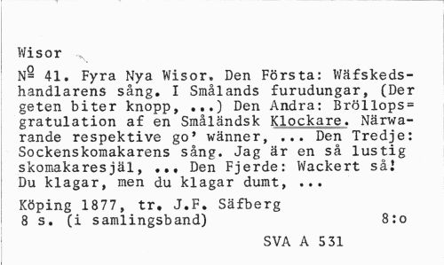 //// Wisor //// N= 41. Fyra Nya Wisor. Den Första: Wäfskeds-handlarens sång. I Smålands furudungar, (Der geten biter knopp, ...) Den Andra: Bröllops= gratulation af en Småländsk Klockare. Närvarande respektive go' wänner, ... Den Tredje: Sockenskomakarens sång. Jag är en så lustig skomakaresjäl, ... Den Fjerde; Wackert såj Du klagar, men du klagar dumt, ... //// Köping 1877, tr. J.F. Säfberg 8 s. (i samlingsband) 8:o //// SVA A 5 31 ////