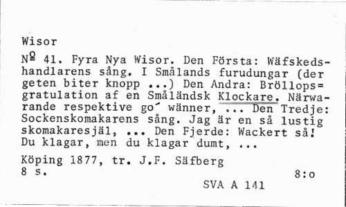 //// Wisor //// N- 41. Fyra Nya Wisor. Den Första: Wäfskeds-handlarens sång. I Smålands furudungar (der geten biter knopp ...) Den Andra: Bröllops= gratulation af en Småländsk Klockare. Närvarande respektive go' wänner, ...Den Tredje: Sockenskomakarens sång. Jag är en så lustig skomakaresjäl, ... Den Fjerde: Wackert såj Du klagar, men du klagar dumt, ... //// Köping 1877, tr. J.F. Säfberg //// 8 s. 8:o //// SVA A 141 ////
