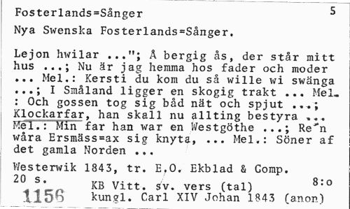 //// Fosterlands=Sånger 5 //// Nya Swenska Fosterlands=Sånger. //// Lejon hwilar ..."; Å bergig ås, der står mitt hus ...; Nu är jag hemma hos fader och moder ... Mel.: Kersti du kom du så wille wi swänga ...; I Småland ligger en skogig trakt ... Mel. : Och gossen tog sig båd nät och spjut ...; Klockarfar, han skall nu allting bestyra Mel.: Min far han war en Westgöthe ...; Re*n wåra Ersmäss=ax sig knyta, ... Mel.: Söner af det gamla Norden ... //// Westerwik 1843, tr. E.O. Ekblad & Comp. //// 20 s> KB Vitt. sv. vers (tal) 8:0 //// 1158 kungl. Carl XIV Johan 1843 (anon) ////