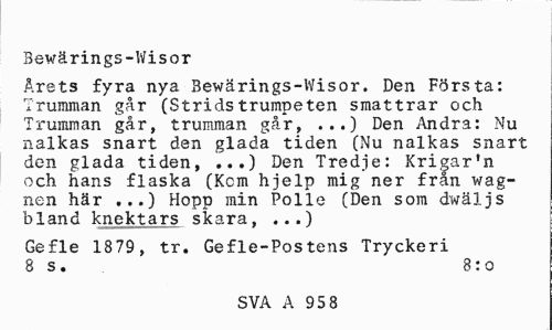 //// Bewärings-Wisor //// Årets fyra nya Bewärings-Wisor. Den Första: Trumman går (Stridstrumpeten smattrar och Trumman går, trumman går, ...) Den Andra: Nu nalkas snart den glada tiden (Nu nalkas snart den glada tiden, ...) Den Tredje: Krigar'n och hans flaska (Kem hjelp mig ner från wag-nen här ...) Hopp min Polle (Den som dwäljs bland knektars skara, ...) //// Gefle 1879 , tr. Gefle-Postens Tryckeri 8 s. 8:0 //// SVA A 95 8 ////