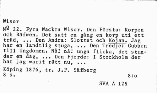 //// Wisor //// N- 22. Fyra Wackra Wisor. Den Första: Korpen och Räfwen. Det satt en gång en korp uti ett träd, ... Den Andra: Slottet och Kojan. Jag har en landtlig stuga, ... Den Tredje: Gubben till Ungdomen. Nål nå! unga flicka, det stundar en dag, ... Den Fjerde: I Stockholm der har jag warit rätt nu, ... //// Köping 1876, tr. J.F. Säfberg //// 8 s. 8:o //// SVA A 125 ////