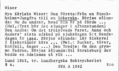 //// Wisor //// Nya Kärleks Wisor: Den FörstarFrån en Stockholms = Jungfru till en Kokerska. Börjas sålunda: Nu du undrar, hwad som ar på färde ... (Mel.:Tys t hör det sjunger i aftonstunden) Den Andra: Om det trolofwade Paret. Anna och Anders' sista afsked på sjuksängen S:t Handsdagen år 1364. Börjas*sålunda: Lär älskare! I älskarinnor kära ... (Mel.: Suckar, tårar, knäfall, ånger ...) Den Tredje: Om den grymme Fadren. Börjas sålunda:Uti Stralsburg der bodde en Adelsman så rik ... //// Lund 1865, tr. Lundbergska Boktryckeriet //// 8 s' SVA A 1042 8:0 ////