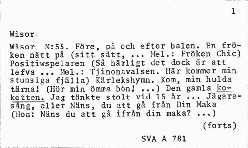 //// 1 //// Wisor //// Wisor N:55. Före, på och efter balen. En fröken nätt på (sitt sätt, ... Mel.: Fröken Chic) Positiwspelaren (Så härligt det dock är att lefva ... Mel.: Tjinonavalsen. Här kommer min stunsiga fjälla) Kärlekshymn. Kom, min hulda tärnal (Hör min ömma bönJ ...) Den gamla ko-ketten. Jag tänkte stolt vid 15 år ... Jägaresång, eller Näns, du att gå från Din Maka (Hon: Näns du att gå ifrån din maka? ...) //// (forts) //// SVA A 781 ////