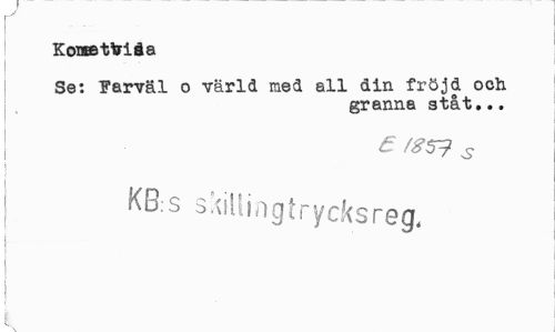 //// Koraetfriåa //// ! Se: Farväl o värld med all din fröjd och //// granna ståt... //// | £ s //// ! //// KB:S SAillingtryclisreg. //// i //// I | //// $ i... ////